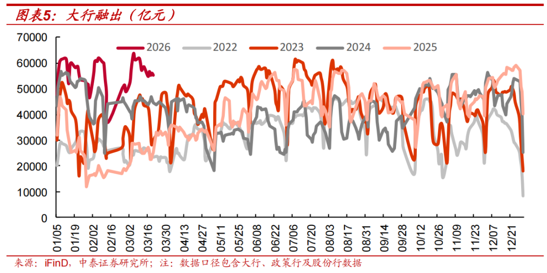 大行融出日均环比小幅下行。3月16日-3月20日大行融出规模合计27.84万亿元,单日最高融出规模5.7万亿元,日均融出规模5.6万亿元,环比前一周日均值下行0.37万亿元。
