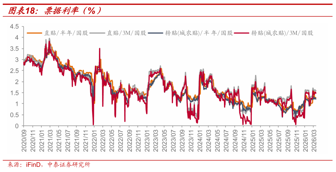 本周票据利率下行。截至3月20日,3M期国股直贴利率、3M期国股转贴利率、6M期国股直贴利率、6M期国股转贴利率分别为1.58%、1.48%、1.23%、1.22%,较3月13日分别变动-4BP、-5BP、-3BP、-6BP。