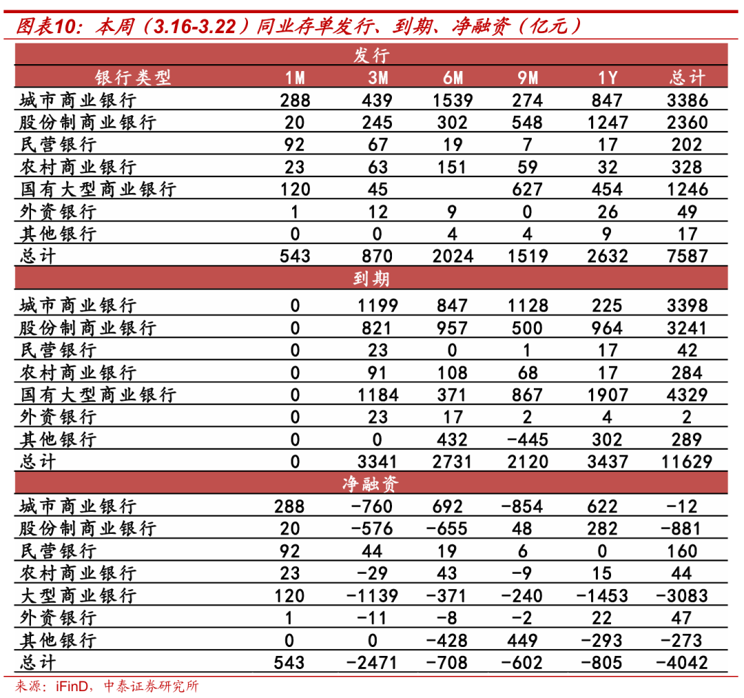 本周(3.16-3.22,下同)同业存单发行规模环比减少,净融资额为负。总发行量为7586.9亿元,较上周减少872.0亿元;到期总量11628.6亿元,较前一周增加1546.6亿元。净融资额为-4041.7亿元,较上周减少2418.6亿元。