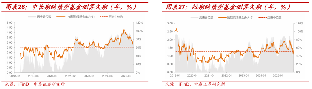 中长期纯债基金久期环比小幅回升。截至3月20日,中长期纯债型基金较3月13日回升0.01年至3.03年,位于2025年以来11%历史分位数水平;短期纯债型基金较3月13日回升0.17年至1.48年,位于2025年以来41%历史分位数水平。