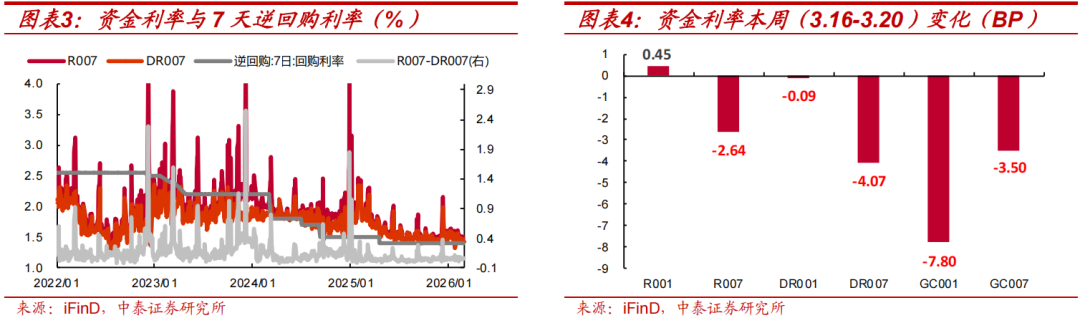 本周资金价格多数下行。截至3月20日,R001、R007、DR001、DR007分别为1.4%、1.48%、1.32%、1.42%,较3月13日分别变动0.45BP、-2.64BP、-0.09BP、-4.07BP,分别位于19%、8%、15%、2%历史分位数。
