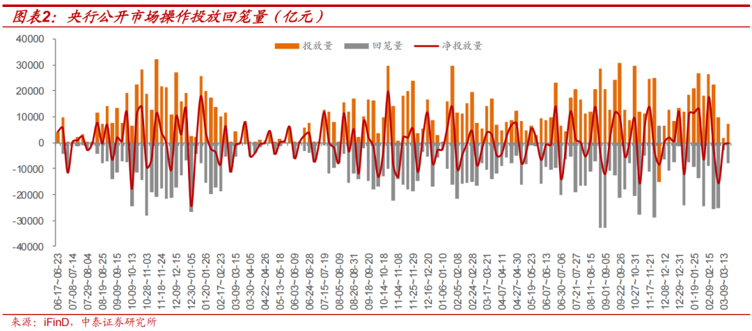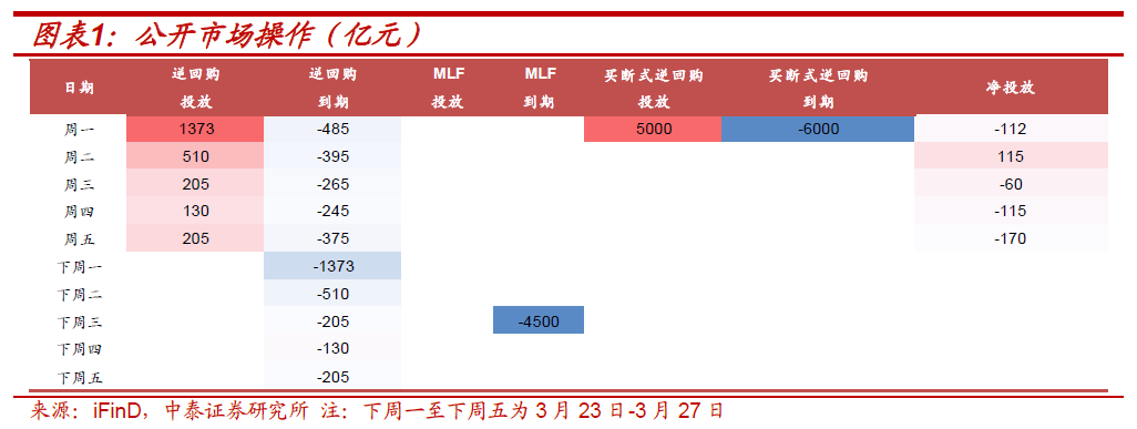 本周(3.16-3.20,下同)共有1765亿元逆回购到期。周一至周五央行分别投放逆回购1373、510、205、130、205亿元,期间累计投放2423亿元逆回购;周一分别有5000亿元和6000亿元买断式逆回购投放和到期;全周净回笼流动性342亿元。下周三有4500亿元MLF到期。