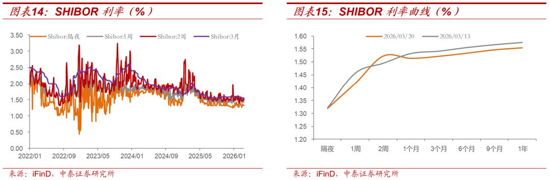 本周Shibor利率多数下行。截至3月20日,隔夜、1周、2周、1M、3M Shibor利率分别较3月13日变动-0.2BP、-4BP、2.8BP、-1.9BP、-2BP至1.32%、1.42%、1.52%、1.51%、1.52%。