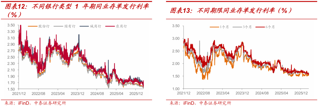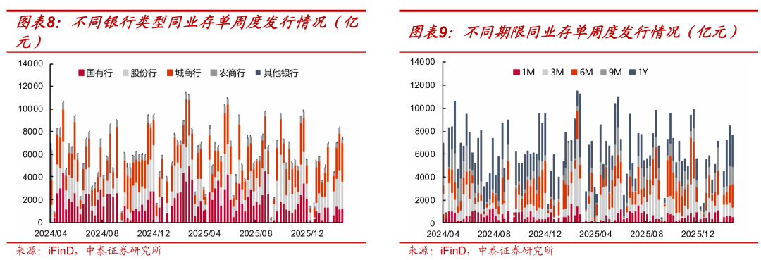 分期限类型来看,1Y发行规模最高。1M、3M、6M、9M、1Y同业存单的发行规模分别为543.2亿元、869.9亿元、2023.7亿元、1518.5亿元和2631.6亿元,较前一周分别变化-53.8亿元、-302.2亿元、472亿元、-165.8亿元和-822.2亿元。1Y存单占分类型银行存单总发行量比例最高,占比34.69%,主要是股份行发行较多;6M期限占比为26.67%,主要是城商行发行较多。