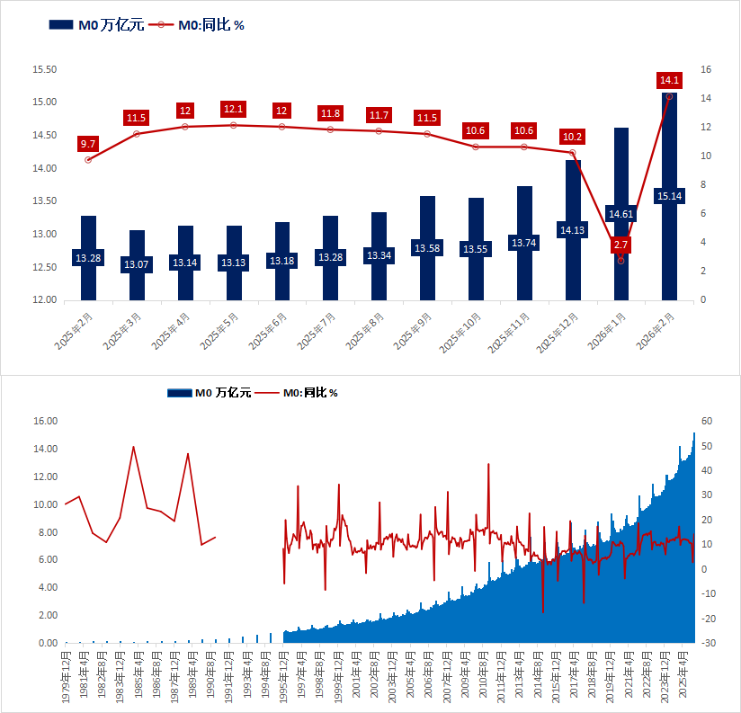 截止2026年2月底,M0余额15.14万亿,同比增长14.1%。