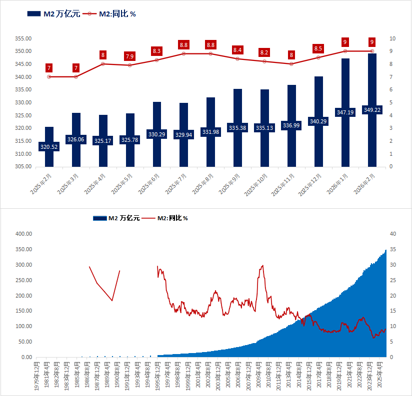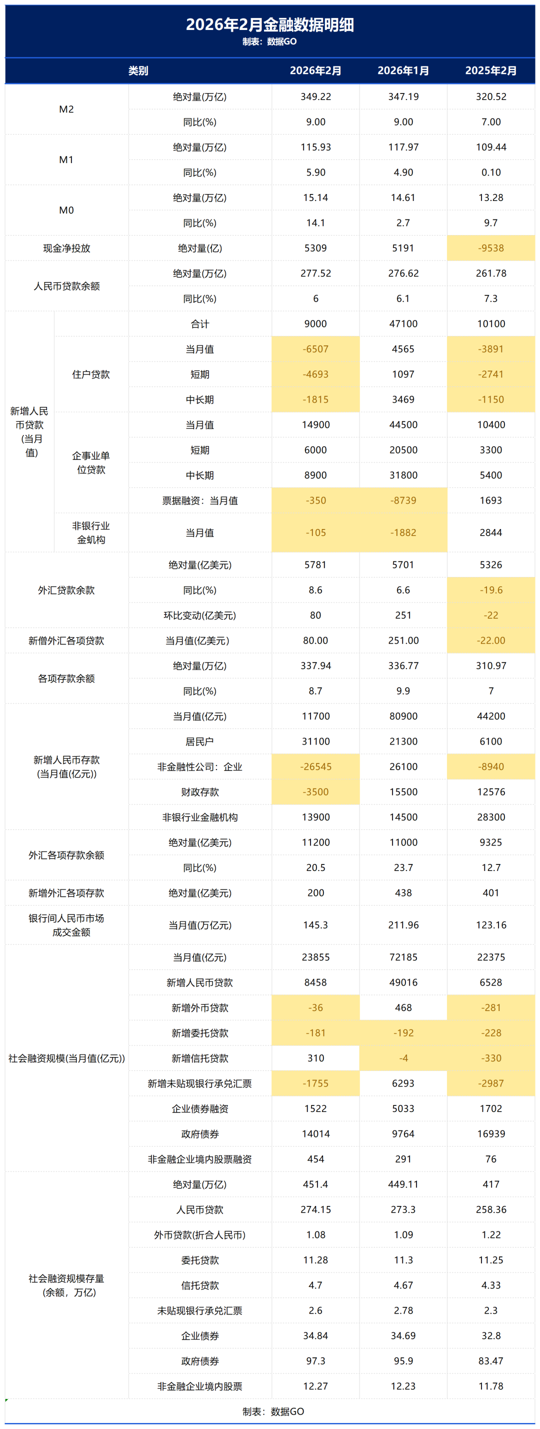 根据央行公布的数据,截止2026年2月底,M2余额349.22万亿,同比增长9%。根据数据GO测算,2月底M2余额环比增加2.03万亿。
