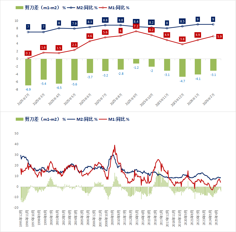 根据数据GO测算,调整后数据看,2月份M1与M2剪刀差(M1-M2)是3.1%,比1月底收窄。
