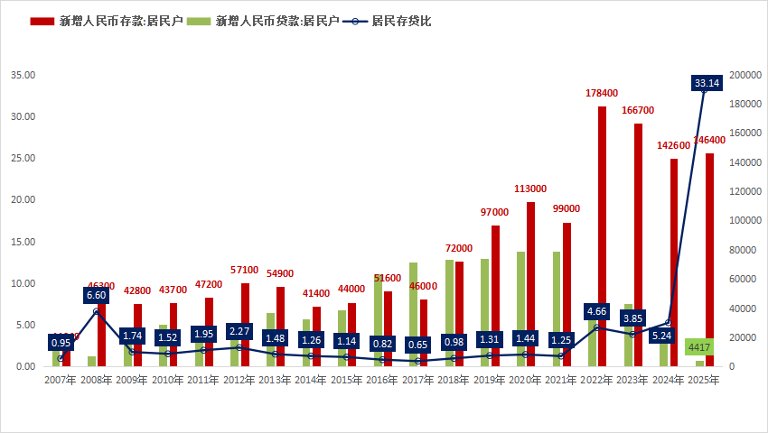 数据显示,2025居民存款金额累计14.64万亿,是历年第3高;存贷比33.14,是历史新高。居民存款的增长起始于2018年(那一年7.2万亿),爆发于2022年(一年新增17.84万亿)。居民贷款快速增长起始于2016年(6.33万亿),高峰于2021年(7.92万亿),于2025年降到4417亿。