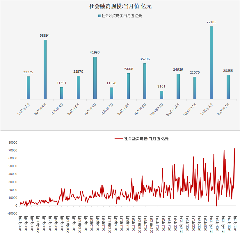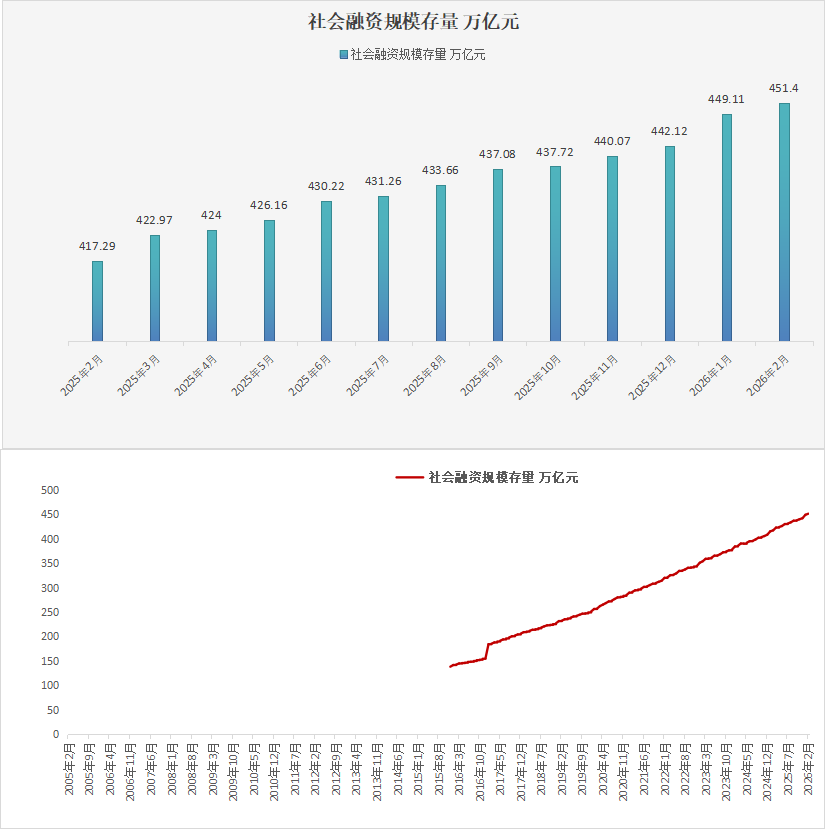 2026年2月社融新增23855亿元。2026年到2月底,社融存量451.4万亿,环比增加2.29万亿,继续创新高。社融100万亿存量是2013年12月份,200万亿关口是2017年9月,300万亿关口是2021年6月,400万亿关口是2024年9月。