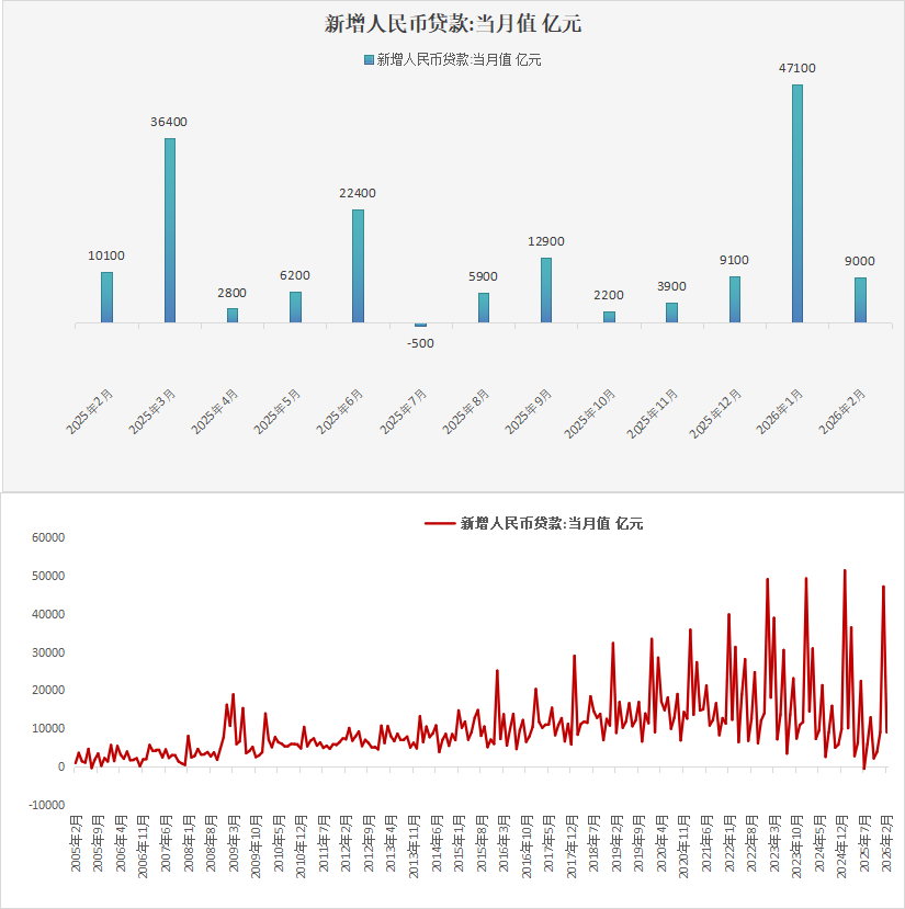 2月新增人民币贷款9000亿元,环比少增38100亿元。